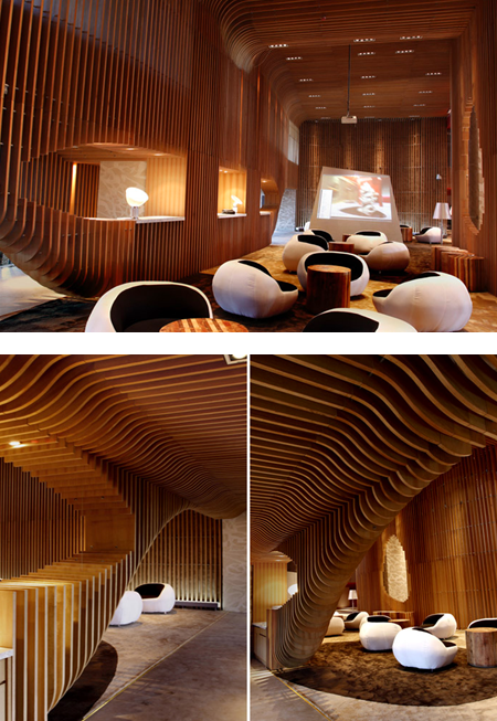有韵律感的木质格栅型态的有机体量覆盖整个空间,为了追求舒适、纯粹的视觉感受,并保证使用方面的便捷性,设计师在这里放置了软性沙发,并选择白色作为木色中的点缀,同时曲面的木质结构浮在表面,一个律动感的曲面墙体格栅使空间半隐半现,朦朦胧胧,打造出东方诗意的婉约与宁静。