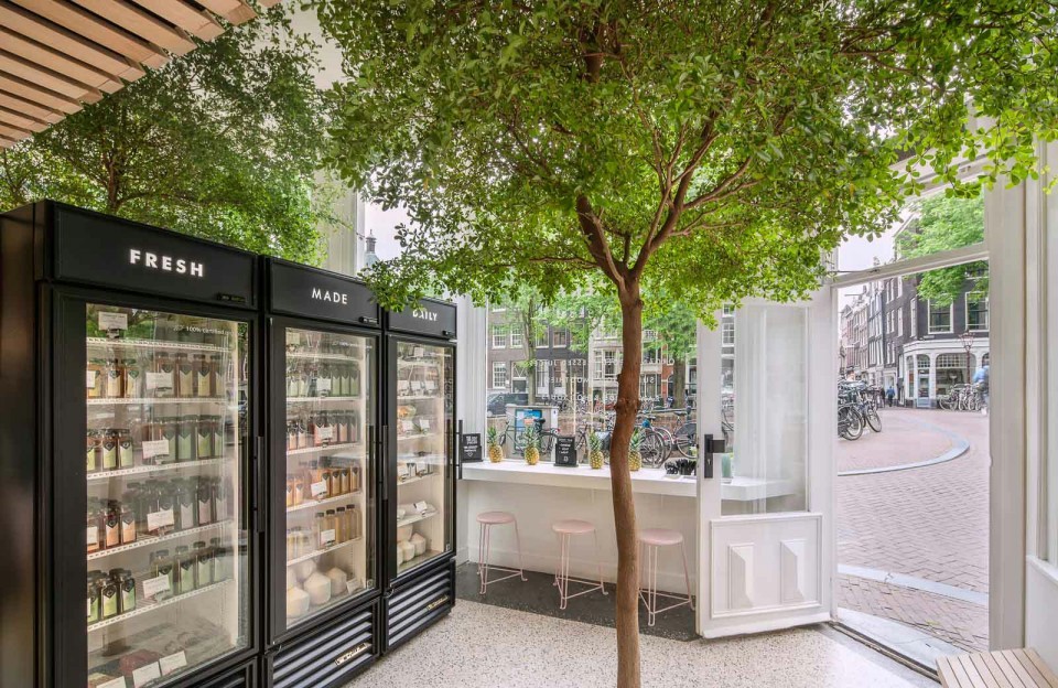 店铺设计将大自然的“绿”意融入其中,将天然、纯粹的概念将其展现,让人眼前一亮,店铺空间中以一颗大树为视觉中心点,柜面天花均穿插原木元素的线条,而墙壁的镜面让整个空间有更空旷的错觉感,打造了一个迷你森林小花园,让生活在这座城市或者是来旅游的人们,在这里都能暂时远离城市的喧嚣,感受这家小店带来的自然绿意。