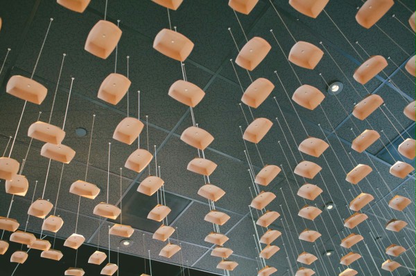这家店铺设计非常特别之处在于它的天花设计,整个布局以多个盛放食物的纸盒托盘组成,每一个分别进行了一次旋转、钻孔,拼接数百个塔可塔。