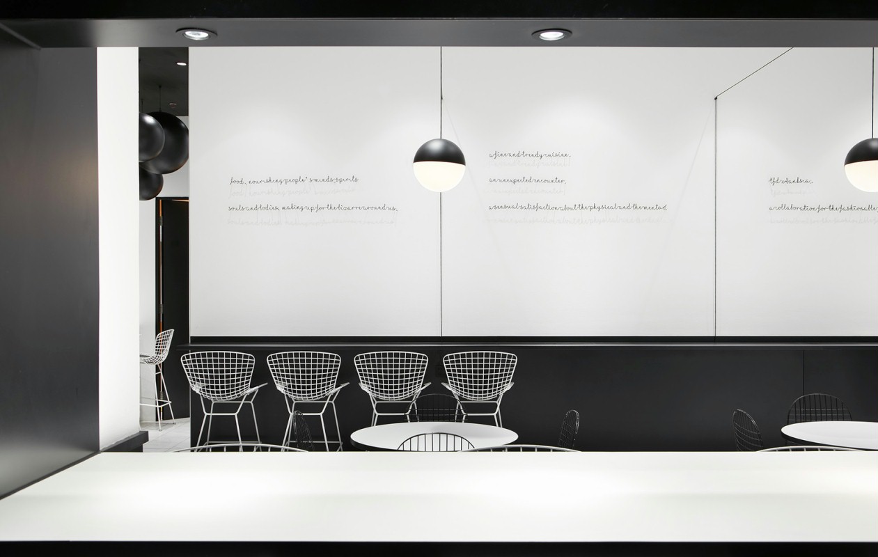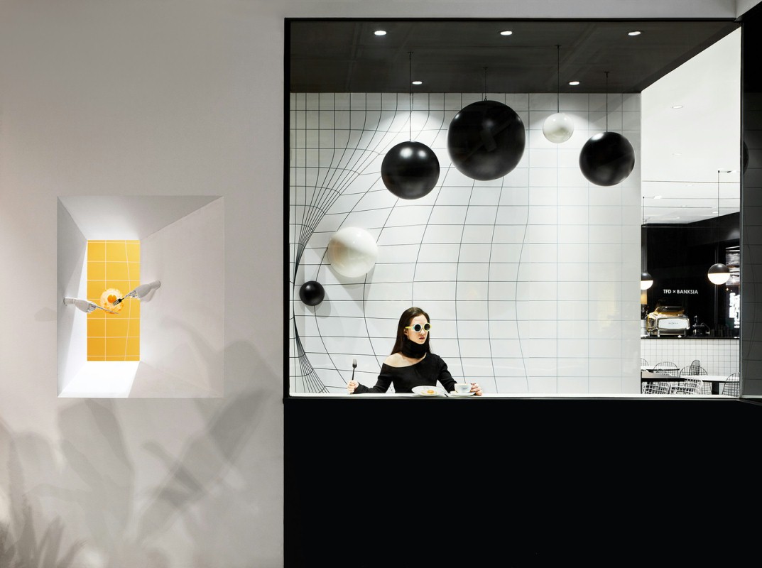 店铺设计围绕黑、白、点线面的交织,相较于时下流行咖啡店的老墙、水泥等复古工业风元素不同,餐厅整个空间从黑与白及点线面的中获取灵感,打造先锋、极简、有格调、同时又暗藏趣味细节。餐厅狭长的外立面被黑色轮廓线清晰划分,大LOGO招牌以光栅立体画的形式呈现“门”的开合动态变化,与品牌名称“一尚门”相呼应。