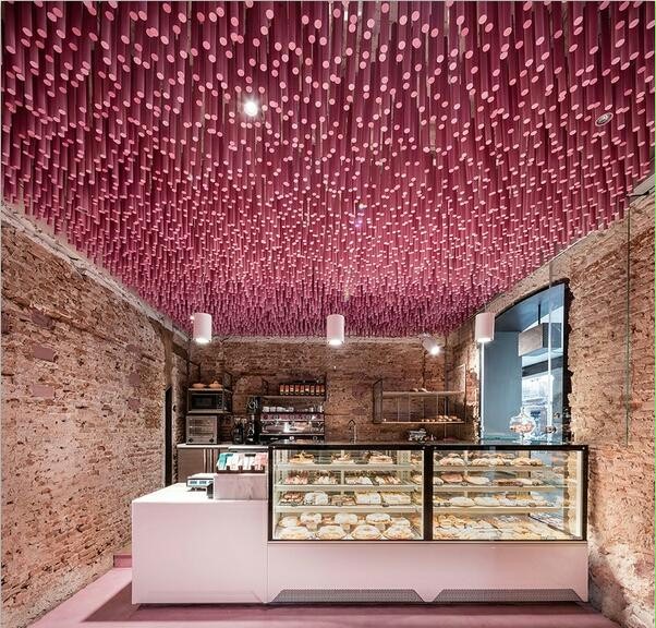 店铺设计是由极具历史背景的房屋改造而成的,色彩鲜艳的现代面包店设计特色氛围由12000根粉色木棍组成的“珊瑚礁”和保留原始的历史感墙壁形成。“珊瑚礁”从入口呈波浪状延伸铺满天花,每根高度略不同,空间灵动,增添有趣又优美的独特个性,这也是吸引人群的关键所在。空间相应搭配粉色木棍形态以及穿插的灯光效果。颜色相似的座椅和吧台。粉色的光彩流连在古老的墙壁上,散发出复古而浪漫的气息。