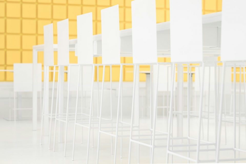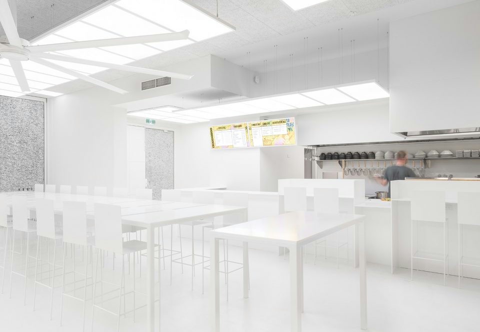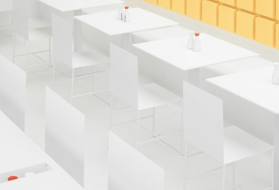店铺设计以东京的地铁站和火车设计为灵感,将白色作为室内的主要基调,同时突显出代表品牌的黄色。空间当中现代感的平面设计元素搭配菜单、引导标识、方块板与大门形成视觉焦点。白色的空间宁静简洁却不冷清,用餐区以黄色方块状的背景墙衬托,增加用餐体验的感受温度。
