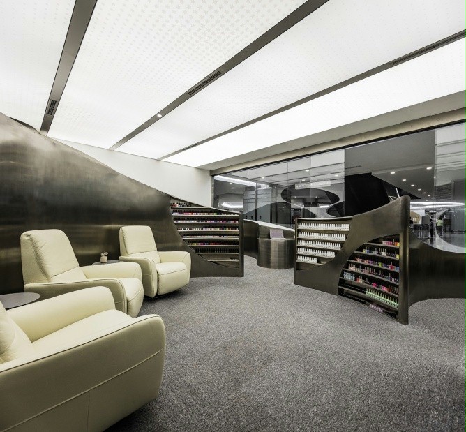 制造出的高低错落的山丘,从中划分了大小不一的山洞形式的空间,这些空间根据视线关系以及实用性来构成不同的美甲美容区域,不仅保有形态上的美观也兼顾了空间的实用性。整个空间使用的材质拉丝不锈钢板与灰色地毯地面软硬结合,强化灰色调的山洞空间。而山丘顶部喷成白色与周边墙面和光亮的屋顶连成一体。屋顶采用软膜天花,软膜表面印刷有不同密度的花朵图案,使室内光均匀而富于变化。