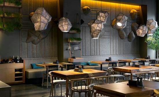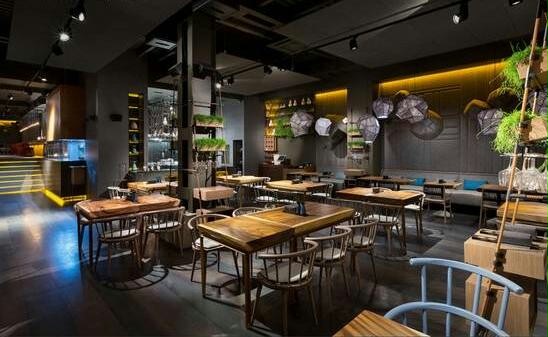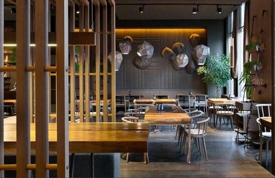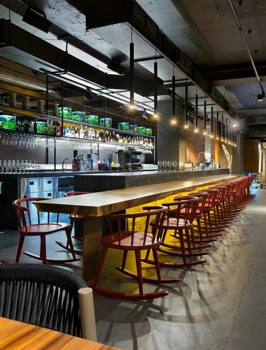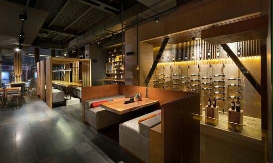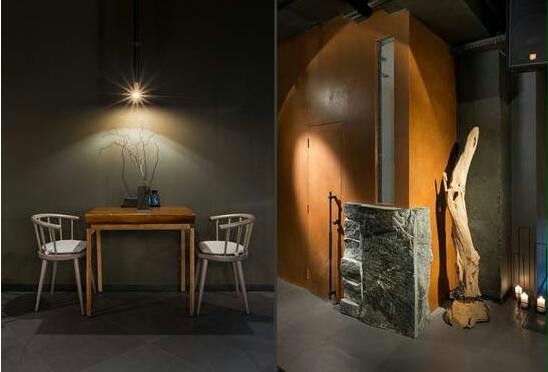 店铺设计巧妙的运用灯光细节,整个空间的气氛比较注重视觉及情感氛围的烘托,桌面在材质上选用棕榈树和橡木板,显得明亮而光滑。走廊通道硬性质感的钢材质与穿透孔中呈现的柔和的光线相互融合,形成对比同时也给人舒缓的愉悦感受,天花板处,布置了异形的灯光设备,也展示了空间的独特性