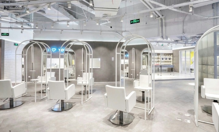 在整个空间中,“定制”的设计随处可见。入口半圆拱的门面形状设计与标志白漆手柄匹配。不同的色调搭配将沙龙内部的不同区域分开,每个区域都有其独有的色彩搭配和主题风格。