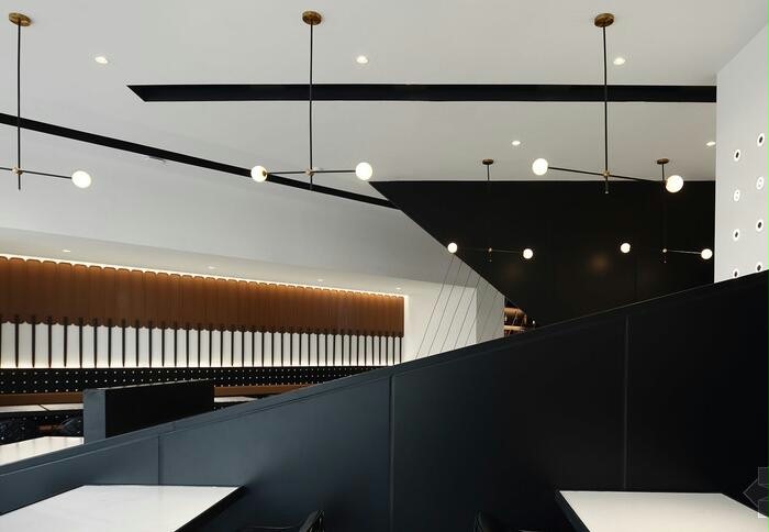店铺设计的空间风格主题为海岸,所以整个设计通过船桨、锚绳、船头等抽象与具象的形态来呈现海岸的意境。整个空间被一个巨大的三角几何贯穿到顶的形态作为区域隔断。给食客有了一定的餐饮私密性,黑色的三角几何又如漂流中的钢琴谱写着一曲海岸的歌曲。