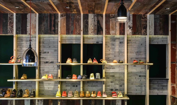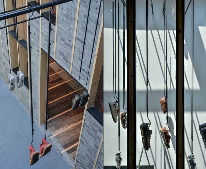 SI设计的理念结合了上海老弄堂的特质,整个空间的内部设计采用古典老式艺术的灯具加以装饰、以做旧式木材及灰砖元素加入,几者完美的衔接呈现出了浓郁的上海风情、创意装置艺术。室外灰砖的弄堂小路可引导顾客进入室内展厅。透过窗户则可见多个创意装置艺术,利用金属管道及吊钩将鞋陈列在橱窗。展区旁的巨大玻璃对展厅有其视觉延伸感,使原有的空间变得更加的宽敞明亮。