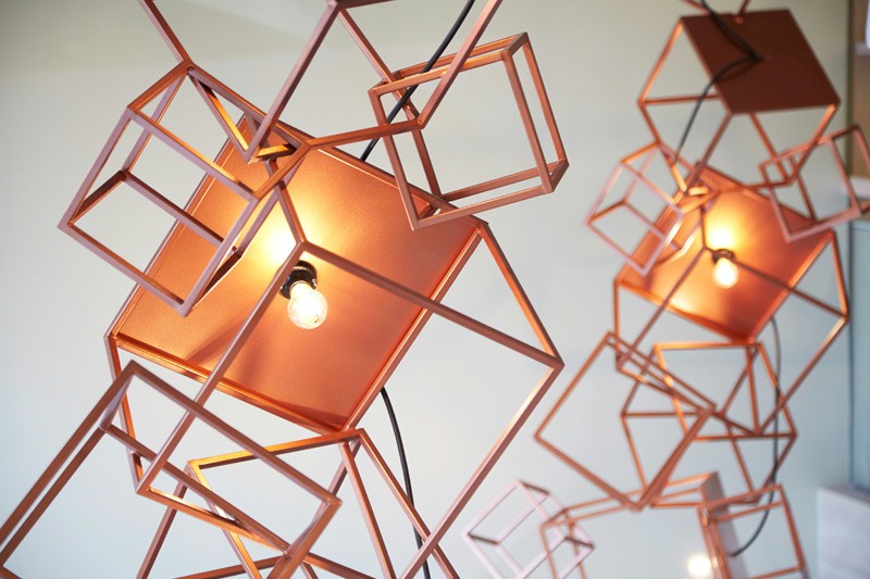 店铺设计理念源自放大多倍的砂糖颗粒形态,采用每颗砂糖的多样性形状,设计成艺术性装置展示在店内,整个空间多运用低饱和度色系,洋溢着清新浪漫的气息。同时运用金铜色钢材质,比如天花上悬挂着的多边形装置灯饰。也提升了整体的质感。此外,在设计上还使用了涂了薄荷绿的木材,它让人感到拥有亲切朴实。大理石吧台让这里显得更加现代和豪华。