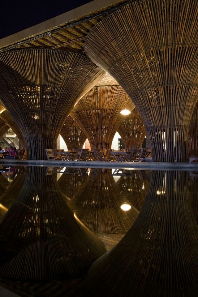 店铺设计空间整体运用自然竹木材质,传统,复古,又极具大自然舒适感,内部结构采用开放式空间,在支撑顶面的立柱上,设计师使其造型上呈现出发散式,竹材编制的立柱,不仅在造型上富有美感形成的自然间隙也保证了透气性与通光性能,屋顶覆以纤维强化塑料板和茅草。天花上半透明合成板材,也极大的保证了整个空间的光感。整个空间仿佛置身奇幻丛林