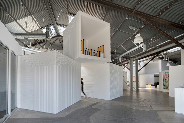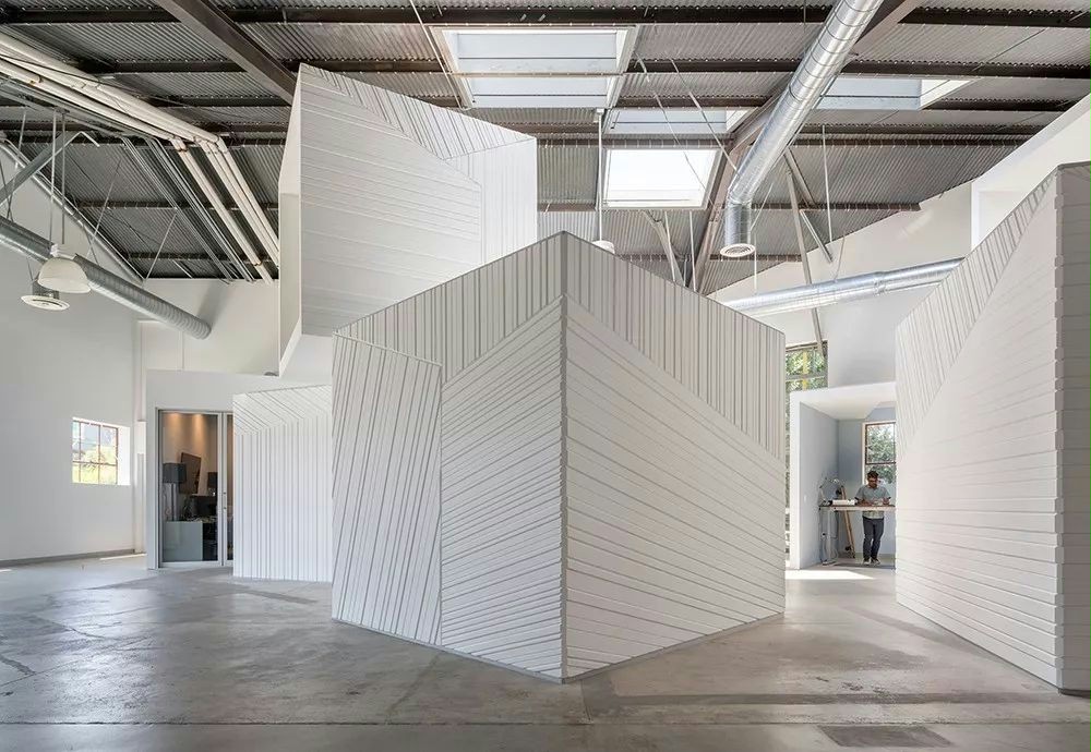 办公室设计由一个个立体方盒子组合而成,以小集装箱积木搭建形式进行拆分,再重新不规则排列造型,创造出了一个稳定灵活的多样性工作结构,每一个盒子都是个半开放式独立空间,使每个空间富有私密性,同时保持相邻空间的链接和灵活度。以白色调为主色调,营造干净舒适安静氛围,整个空间也利用场地特殊的仓库天花板高度使视觉上更突出展示区域与外观空间。在材质表面上运用cnc研磨的MDF的处理,增强了现有的钢框架仓库的波纹金属包层效果。