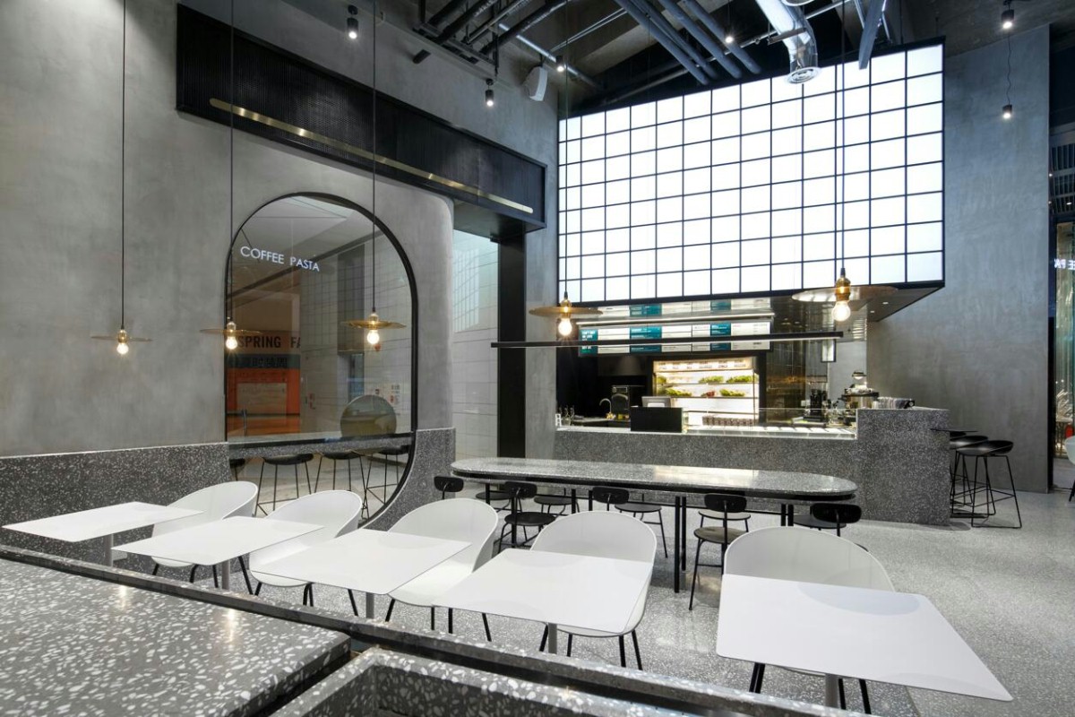 商业设计理念是创造一种自然纯粹又时尚的品质生活理念。主材料选择上,大面积运用了水磨石,水磨石板材之间采用黑色金属收边作为夹心,增加整体轻盈感与品质感,也看起来更精致。就餐区以时下流行的灰色作为主色调,呈现品牌所需的简洁感。同时为了避免灰色调所带来的单一与平淡,采用不同色度与不同材质来丰富层次感。整体的环境给顾客无负担、无压力且更具营养更享受用餐的过程。透露出一种积极、阳光、活力的生活态度。