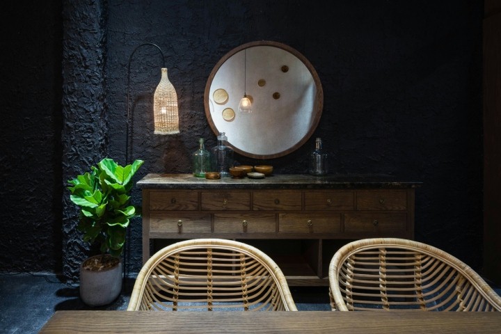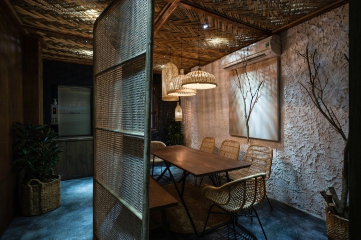 设计上在布置家具上使用的材料格外用心,木材,藤条和铁材料的组合,独具匠心。其中最令人印象深刻的材料是藤条编织的家具,以及墙上用枯枝做成的挂画, 带有一丝的禅意。商业空间设计追求舒适的就餐环境,让客户沉浸在店铺空间里。