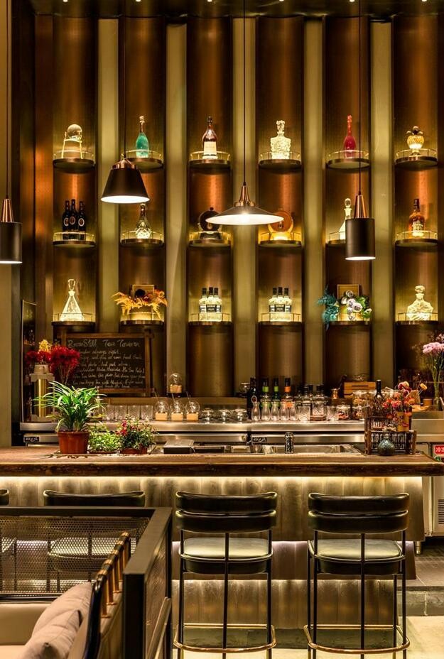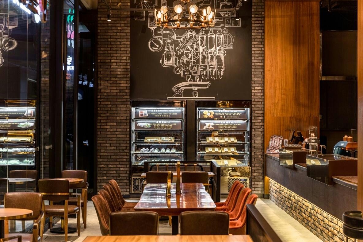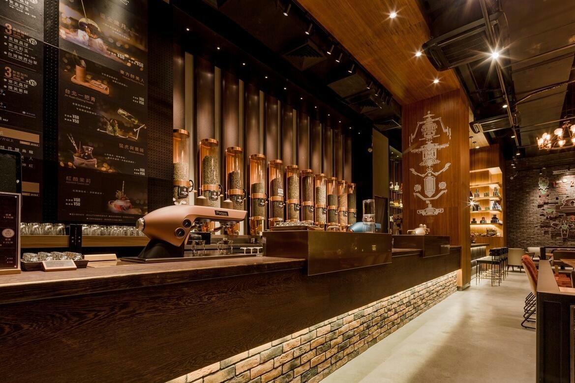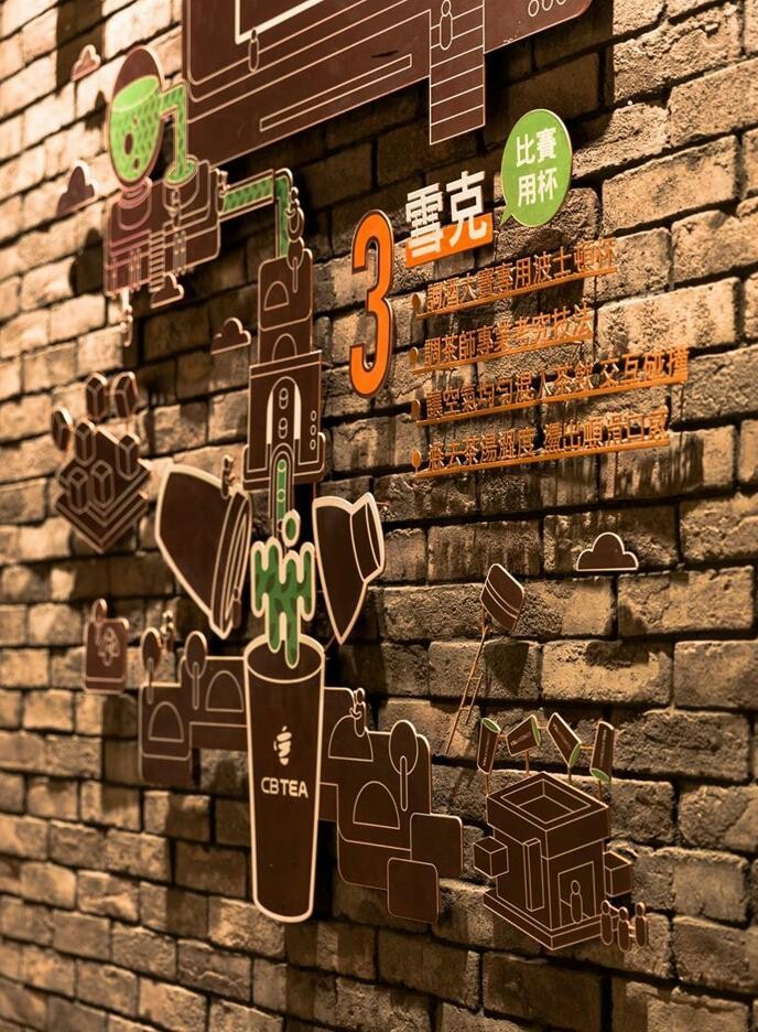 独家设计调茶吧台,墙上萃茶机的图解涂绘,让消费者近距离感受茶香、茶色、茶味。室内用少量的绿植来装饰,屡屡阳光的照射,衬应着室内的冰冷,整体空间以美式的铁艺、机械,与东方的青砖、茶融合,人们在享受的同时,更是体验了多元化茶文化的乐趣。