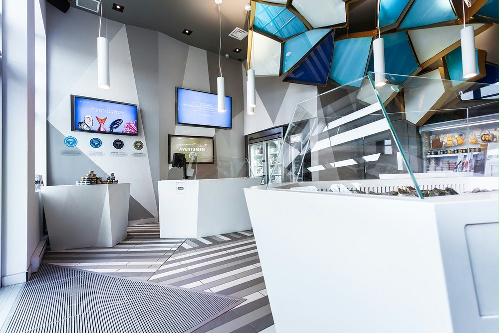 店铺设计以航海的主题贯穿于整个宇宙通过一个充满活力的、棱角分明的内部空间,创造了一种感官之旅。蓝宝石和天蓝色的万花筒,给人以从海底向上看的印象。白色和灰色的瓷砖让人想起船甲板上的硬木板。看似漂浮的冰堡式的展示。风格化的冷却系统顶部有定制的,不对称的玻璃箱,房子龙虾和贝类。