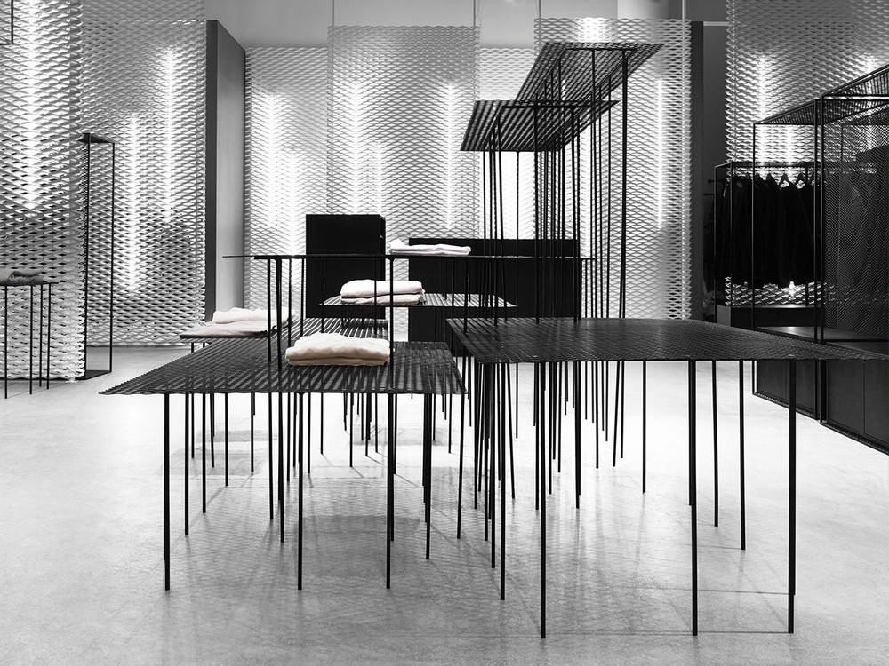 一个现代城市丛林的抽象,立方体的轨道,方形的桌子和高的金属板创造了一个视觉展示的森林。在一个灯光明亮、对比度高的空间里,成为吸引眼球的设计元素,吸引了街头购物者的注意。