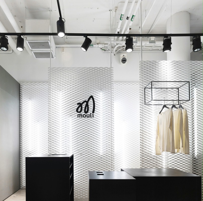 店铺设计了这个“丛林”的概念:灵活性是设计图式中必不可少的元素,考虑到灵活性,穿孔的金属墙是一种动态的装饰,巧妙地将其作为可定制的衣服和产品的悬挂显示。此外,桌腿是可以互换的,这使得堆叠和设计复杂的方式来展示品牌的顶级服装。