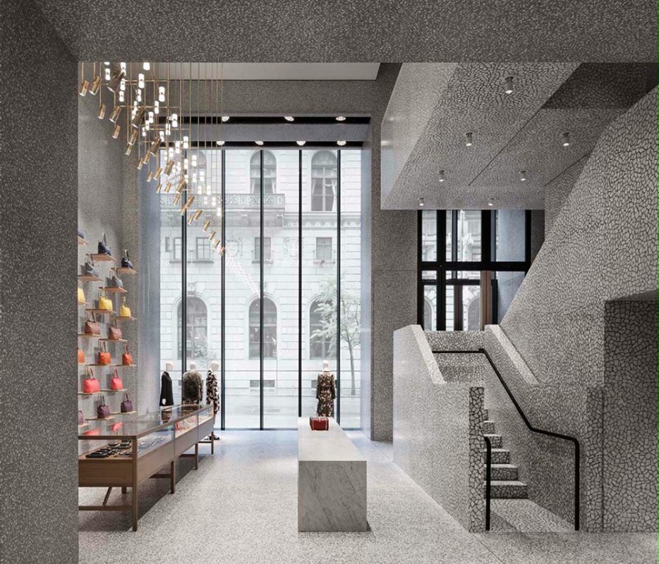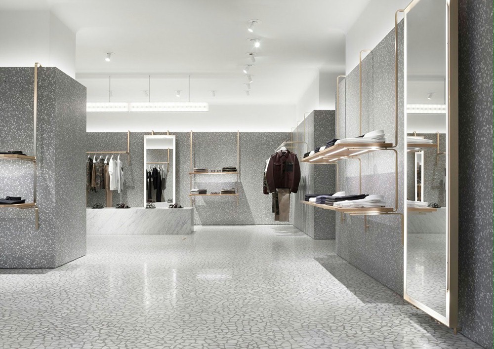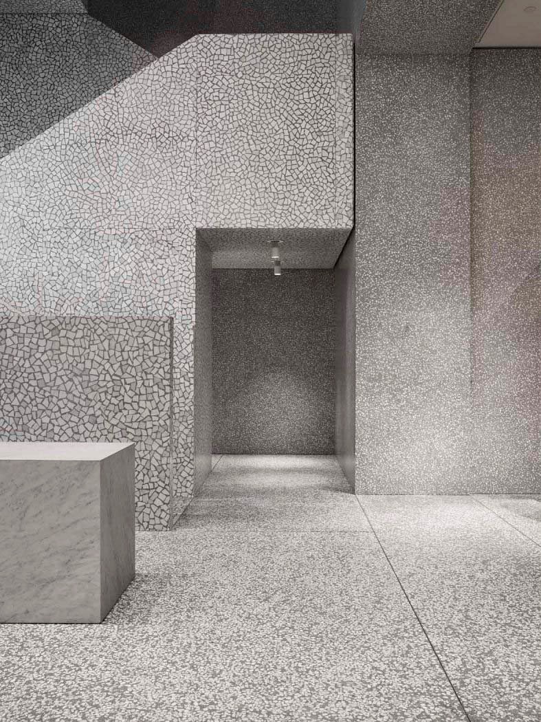 。在整个建筑中都发现了灰色的威尼斯水磨石,但还有一些像皮革、地毯和碳纤维等的元素,增加了一系列房间,每个房间都有不同种类的商品。
