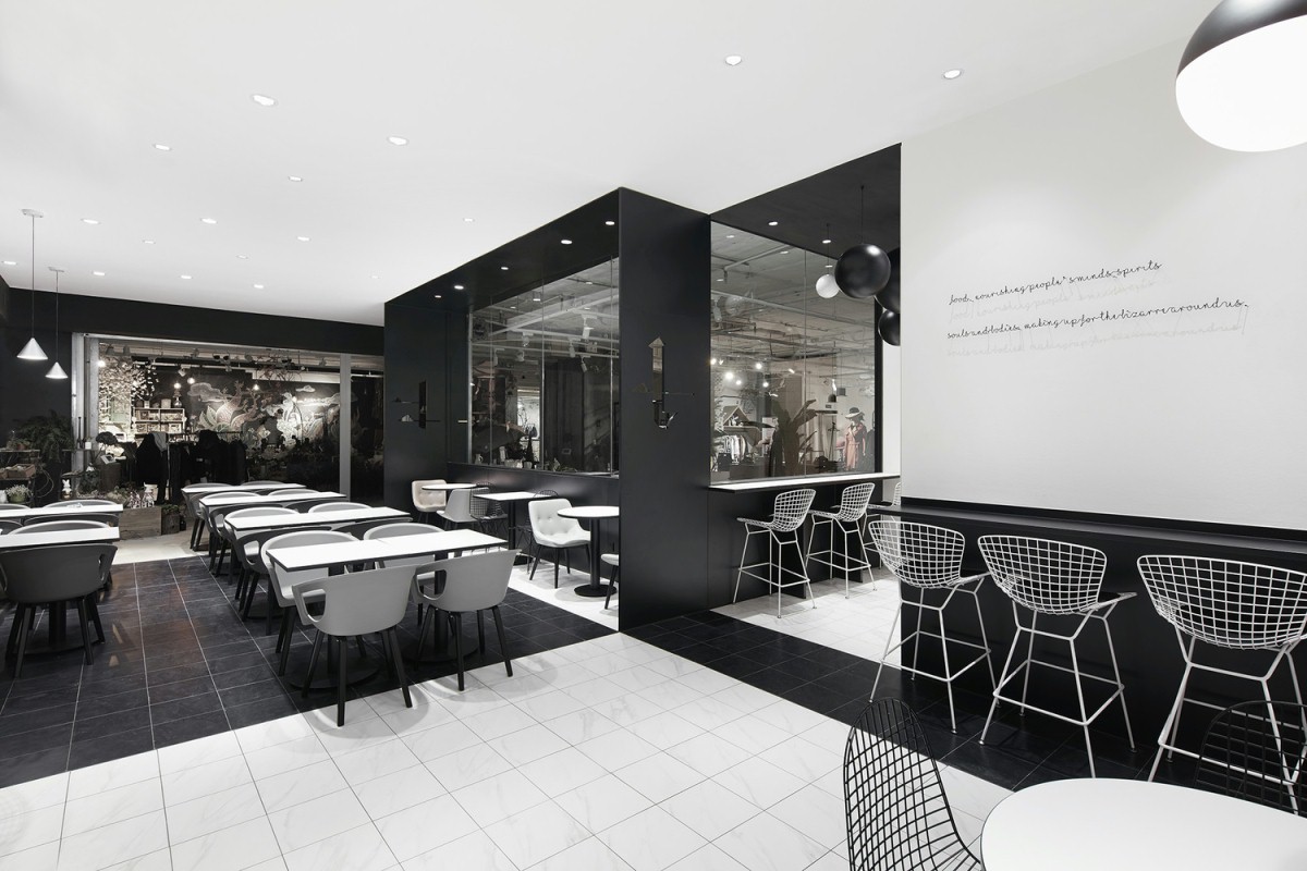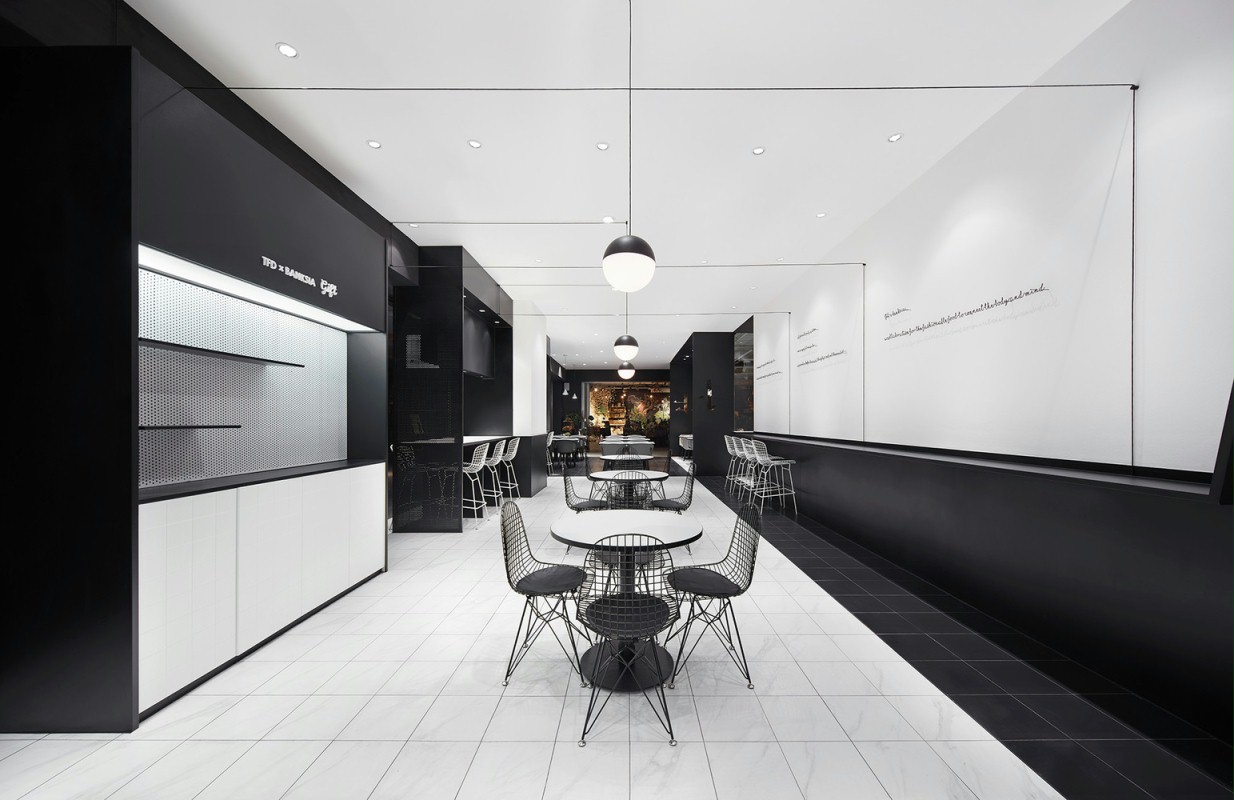 店铺设计围绕黑、白、点线面的交织,相较于时下流行咖啡店的老墙、水泥等复古工业风元素不同,餐厅整个空间从黑与白及点线面的中获取灵感,打造先锋、极简、有格调、同时又暗藏趣味细节。餐厅狭长的外立面被黑色轮廓线清晰划分,大LOGO招牌以光栅立体画的形式呈现“门”的开合动态变化,与品牌名称“一尚门”相呼应。