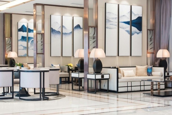 售楼处设计多处运用丝质布料与木质结合的中国传统元素软装, 剔透的水晶灯沉稳的现代装潢,高档的材质运用体现着现代人的品味,精简的线条造型呈现着现代人的干练。中国文化与现代文化的交融,传承与发展碰撞出的空间,很好的诠释了时尚东方,灵动东方的内涵。