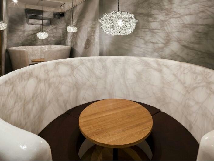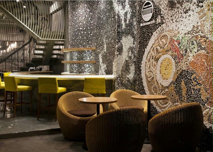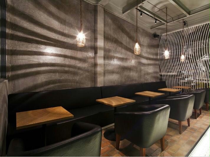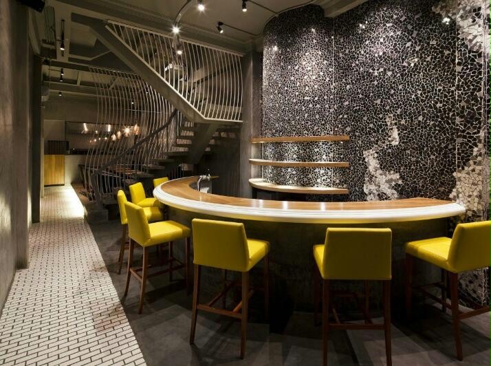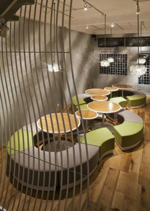 一层的墙面绘有面条的画面手绘,运用高明度的黄色座椅以及保留原始水泥质感的地面,质朴又不乏欢乐气氛,二楼的空间相对设计感更多一些,环形座椅,以及白色隔断包间,纯水泥质感的墙面,简洁干净,在具有设计感的灯具光影下,投射出淡淡那对纹理,在楼梯口,设计师运用钢管材质营造了柔软动感的曲线,犹如流动面条的视觉效果。