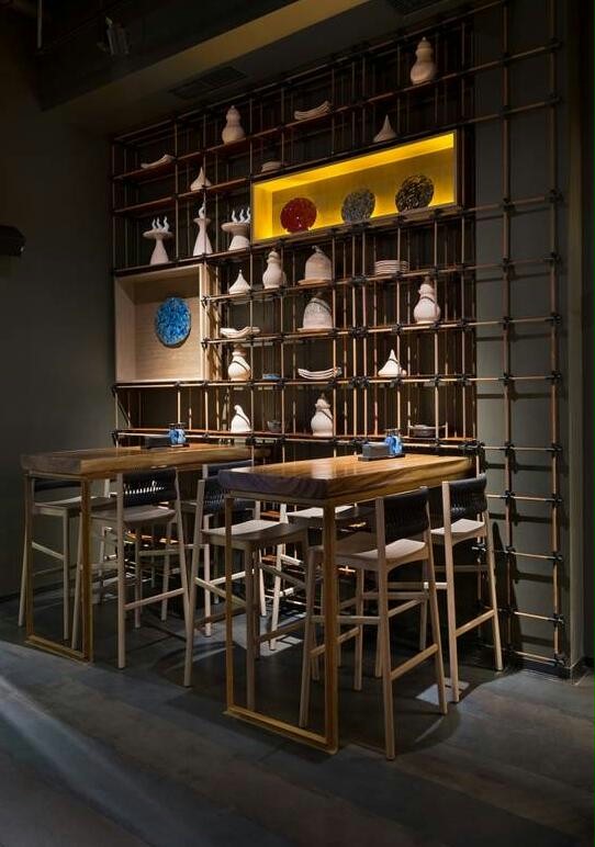 店铺设计巧妙的运用灯光细节,整个空间的气氛比较注重视觉及情感氛围的烘托,桌面在材质上选用棕榈树和橡木板,显得明亮而光滑。走廊通道硬性质感的钢材质与穿透孔中呈现的柔和的光线相互融合,形成对比同时也给人舒缓的愉悦感受,天花板处,布置了异形的灯光设备,也展示了空间的独特性