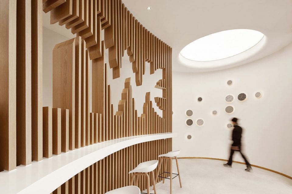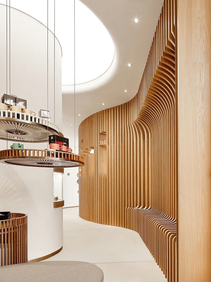 设计中提取茶文化与因味茶品牌中的标志性元素,融入到茶饮空间的诠释当中。空间大量运用的流线设计, 天花的圆顶造型是受传统建筑中天井的启发, 洁净的白色与自然的原木色占据整个空间,让顾客更轻松自在地体验茶道美学。