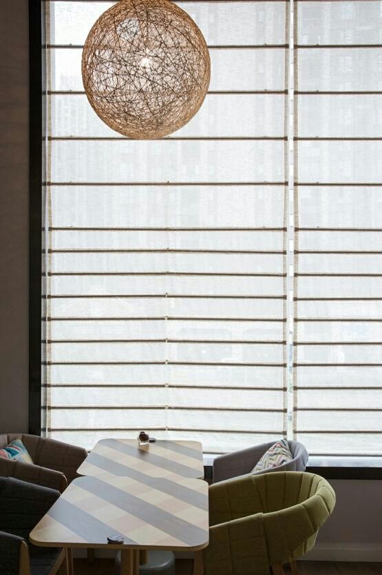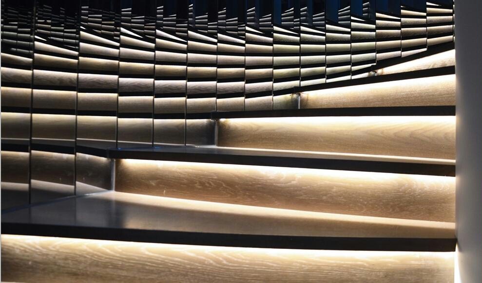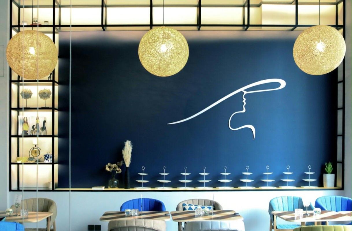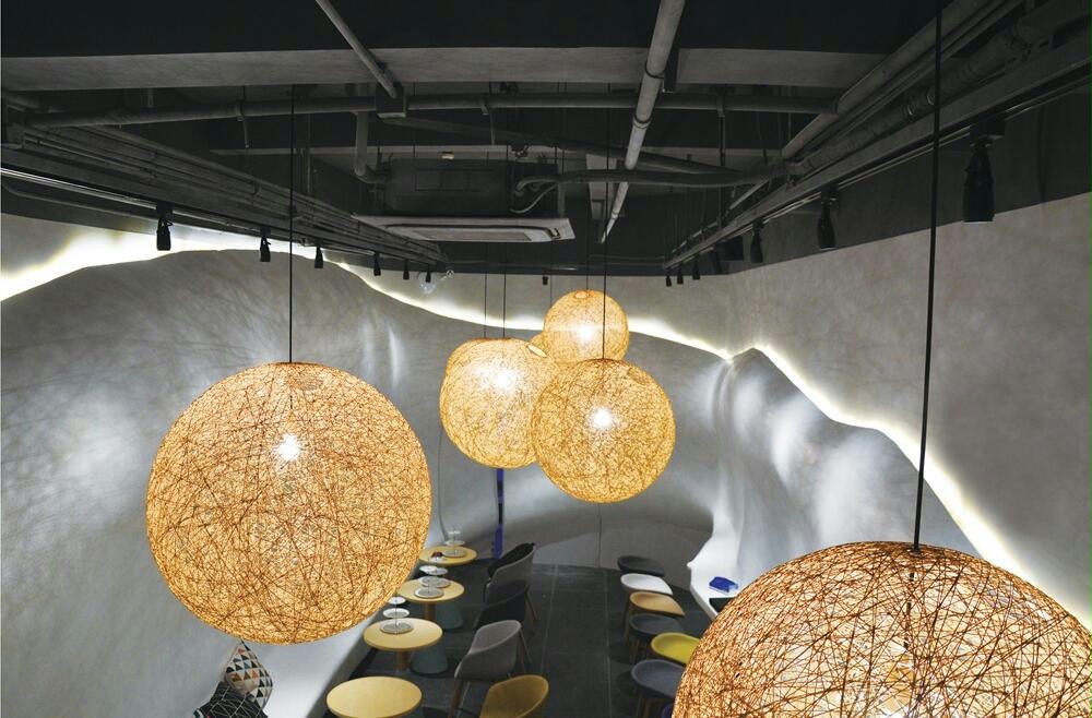 咖啡店的设计理念是以服务女性为主导,空间设计主要以曲线为元素。螺旋状的楼梯正好与曲线元素相呼应。在配色上使用中性的藏蓝色作为外立面的主题色,而内部则选用细腻的白色为主色,突出了女性外柔内刚的特质。大小不一的藤编球形吊灯,使咖啡店多了一份神秘感。
