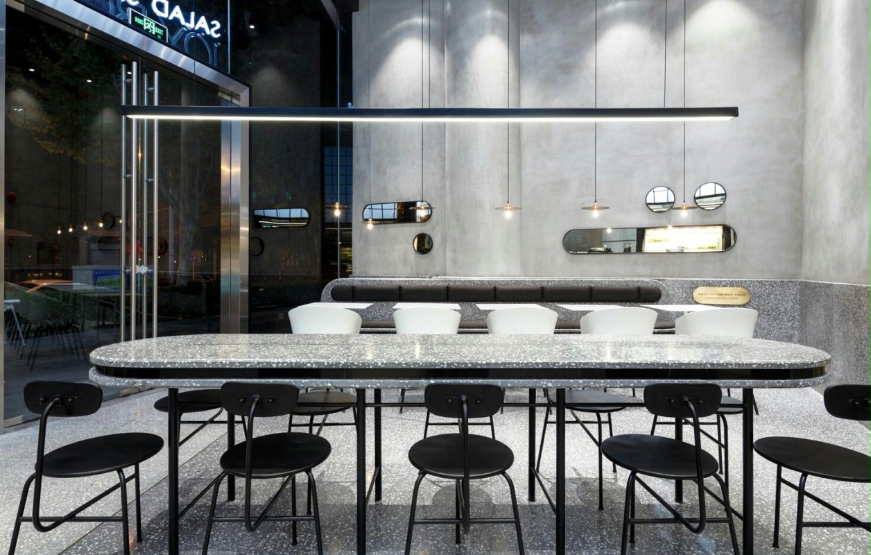 商业设计理念是创造一种自然纯粹又时尚的品质生活理念。主材料选择上,大面积运用了水磨石,水磨石板材之间采用黑色金属收边作为夹心,增加整体轻盈感与品质感,也看起来更精致。就餐区以时下流行的灰色作为主色调,呈现品牌所需的简洁感。同时为了避免灰色调所带来的单一与平淡,采用不同色度与不同材质来丰富层次感。整体的环境给顾客无负担、无压力且更具营养更享受用餐的过程。透露出一种积极、阳光、活力的生活态度。
