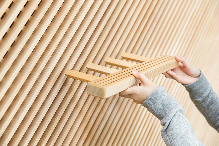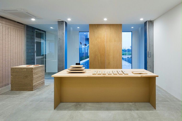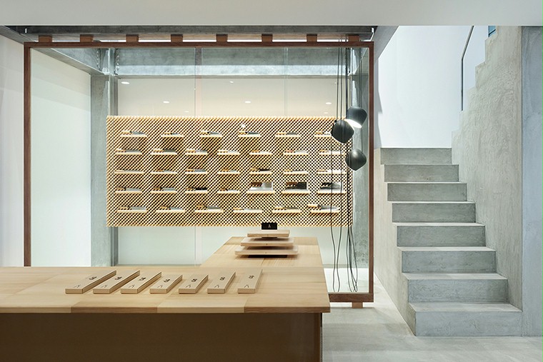 店铺设计上材料元素的运用是店铺SI设计的主要手段,找到与刀具气质符合的材料进行设计,是一项非常重要的抉择。设计上以透明的玻璃、杉木和混凝土的搭配创造出一个丰富又通透的多层次空间,光线设计上自然光和人造环境灯光综合考量,让店铺充满温馨时光,大量木头色泽的漫射让屋内营造出一种暖暖的效果,刀具虽然是刚硬的金属制品,却在木头材料的搭配下变的温润柔和。店面所看到的展示平台使用的云杉木是抗菌碳化木材,以碳化云杉来制作的刀柄和砧板也是独树一帜的设计特色