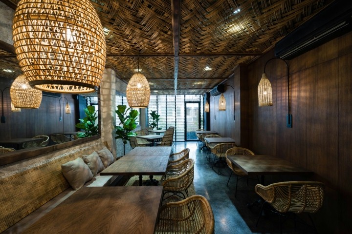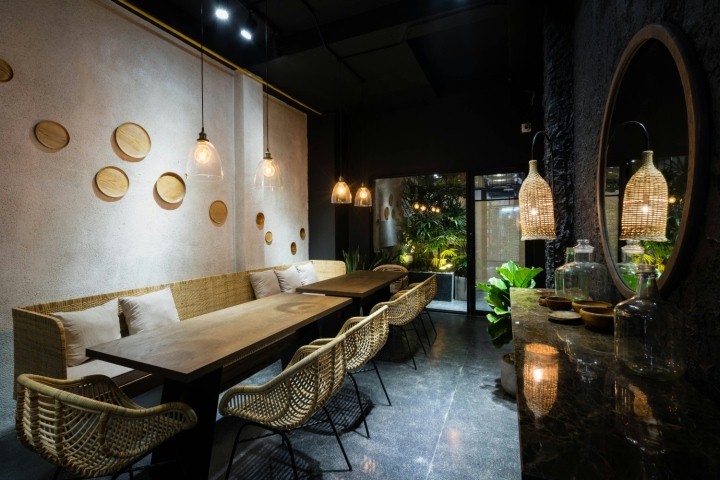 设计上在布置家具上使用的材料格外用心,木材,藤条和铁材料的组合,独具匠心。其中最令人印象深刻的材料是藤条编织的家具,以及墙上用枯枝做成的挂画, 带有一丝的禅意。商业空间设计追求舒适的就餐环境,让客户沉浸在店铺空间里。