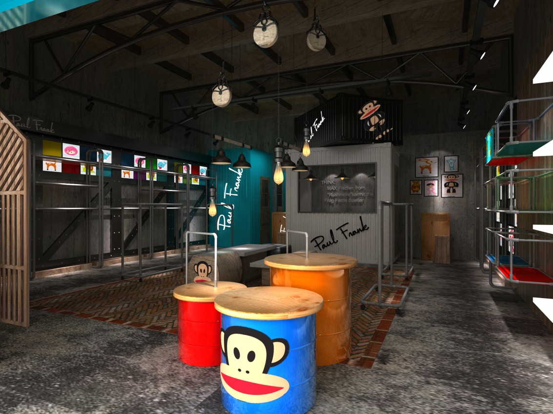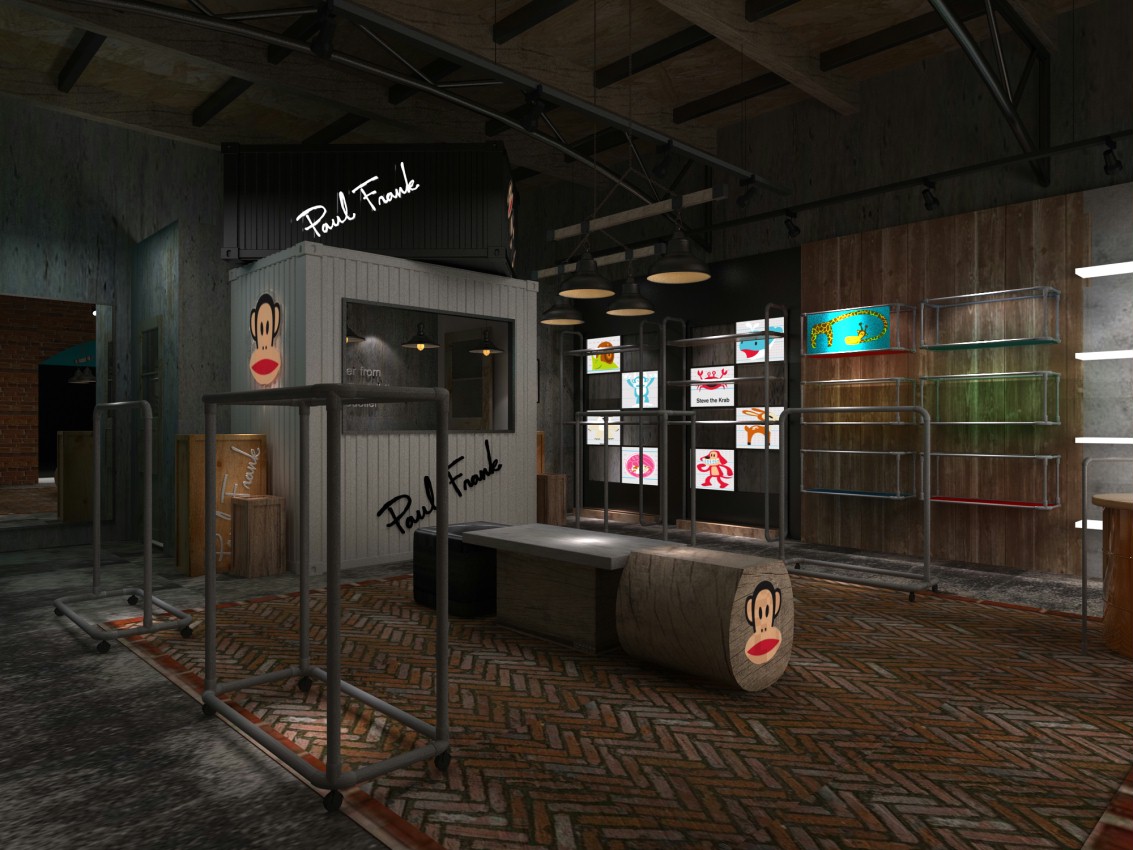PAULFRANK品牌形象设计SI 从美式谷仓文化做延伸,打造品牌原始出发点,整个空间形象还原品牌历史文化,集装箱涂鸦街区元素表达年轻文化,店铺SI设计是追寻品牌属性和店铺空间设计展示效果,考虑店铺VM陈列的可能性,研发设计功能性。品牌形象SI设计考虑品牌的延续性可复制性,连锁形象统一性。